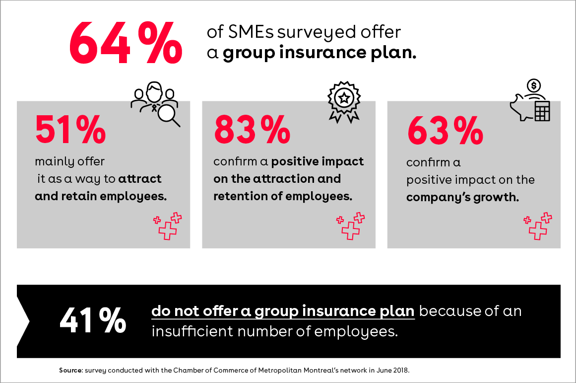 In today's fast-paced economy, SMEs, like large companies, must develop winning business strategies to ensure their long-term growth. In particular, they must bank on innovative HR strategies to emerge as first-rate employers in order to attract and retain a skilled workforce that is essential to their productivity objectives. For more or less equal pay, employees in turn pay heed to many aspects of total compensation, such as paid leave, flexible work schedules, work-life balance, access to training, etc. Among these aspects, a group insurance plan is also a way for a company to stand out. A statement corroborated by the results of the Chamber's recent survey of a sample 302 member companies: 63.2% of these organizations believe their plan has a positive impact on their growth, while 83.4% say that it contributes to attracting and retaining employees. So do you offer a group insurance plan to your employees or are you considering doing so?